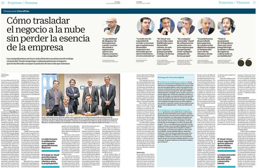 Puedes leer el reportaje completo de ‘Cinco Días’ en este enlace. En el encuentro participaron también Carlos Beldarrain, director de desarrollo de Servicios de Minsait (Indra); Sebastián Barrios, CTO de Cabify; Juanjo Fernández, Consulting & Transformation Manager en la región de EMEA en ATENTO; José Manuel de Diego, Sales Manager B2B IT de LG; y Juan Manuel García Santi, subdirector del Área Puesto de Trabajo y Colaboración de Mapfre.
