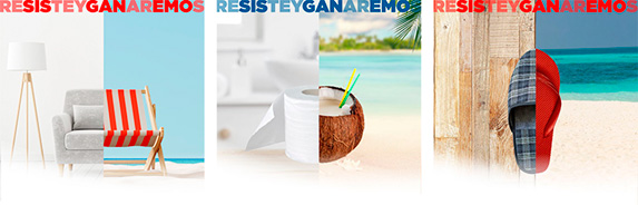 Desde la red Halcón/Ecuador, el mensaje es “Resiste y ganaremos”. La creatividad transforma los característicos iconos vacacionales (una tumbona, un coco o una sandalia) en objetos habituales en las casas, lugar desde el que millones de españoles están librando esta batalla.