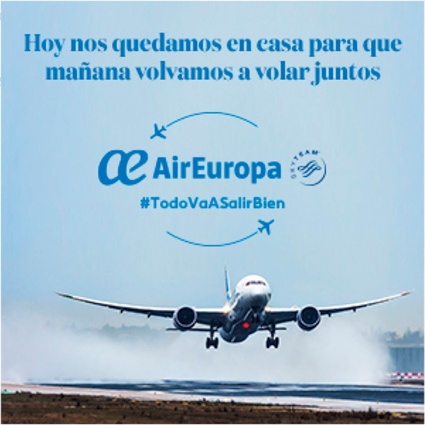 “Todo va a salir bien” es el lema adoptado por Air Europa, en forma de hashtag. «Hoy nos quedamos en casa para que mañana volvamos a volar juntos», añade una imagen distribuida por la compañía junto a uno de sus aviones.