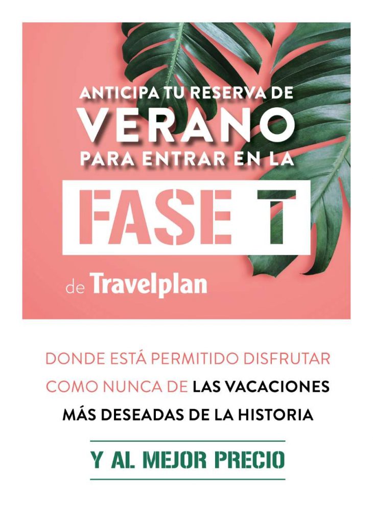 En la Fase T de Travelplan está permitido disfrutar como nunca de las vacaciones más deseadas de la historia. Los clientes podrán obtener precios especiales si reservan entre el 1 y el 21 de junio para viajar a partir del 22 de junio y hasta el 30 de noviembre. Para disfrutar de estas ventajas, sólo tienen que dirigirse a su agencia de viajes habitual.